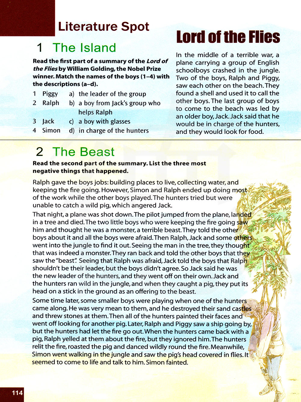 绝命岛 阅读诺贝尔得奖者威廉·戈尔丁的《苍蝇王》的摘要的第一部分。把男孩们的名字(1-4)和描述(a-d)搭配起来。