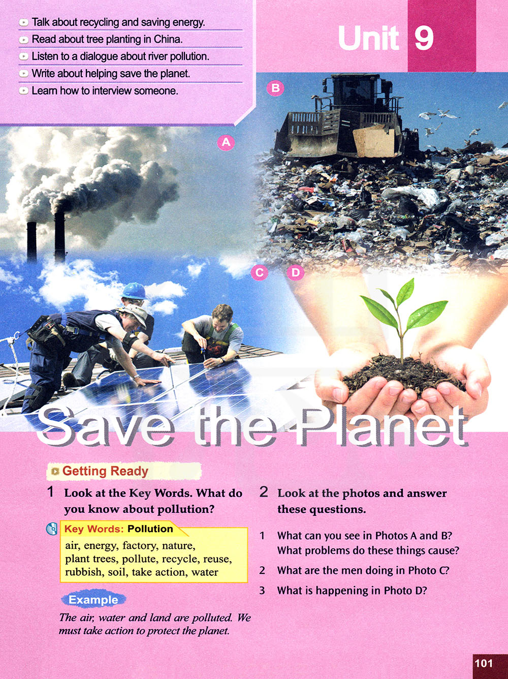 谈论资源回收与节能。 阅读关于在中国植树的文章。 听一听关于河流污染的对话。