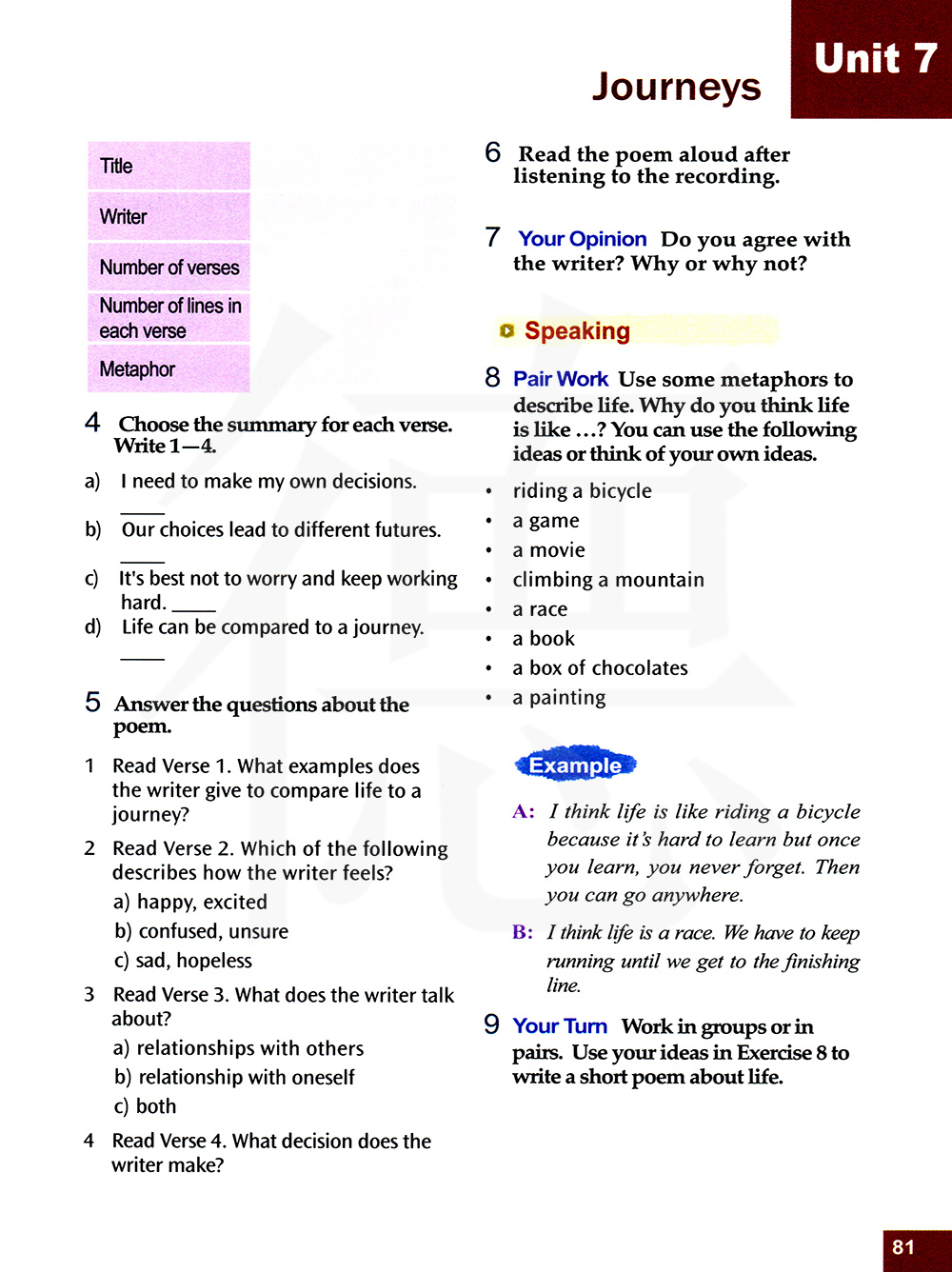 口语 结对活动 用暗喻法来描述生活。你为什么认为生活像......。你可以用下面的想法或者你自己的想法。