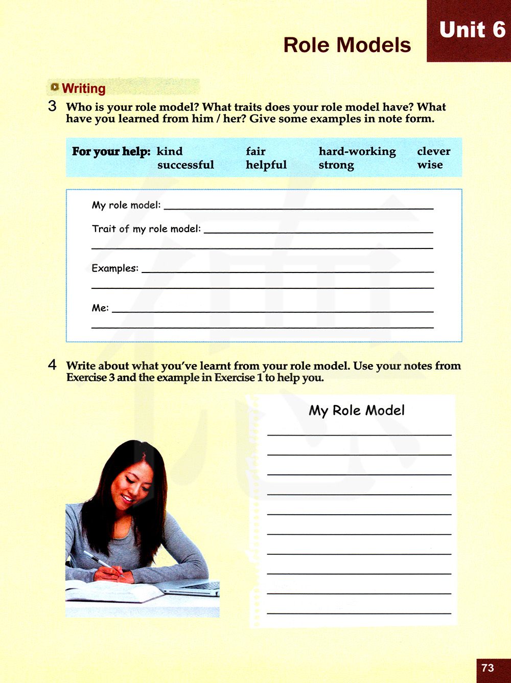 写一写你从你的榜样身上学习到了什么?使用练习3的你的笔记和练习1的例子来帮助你。