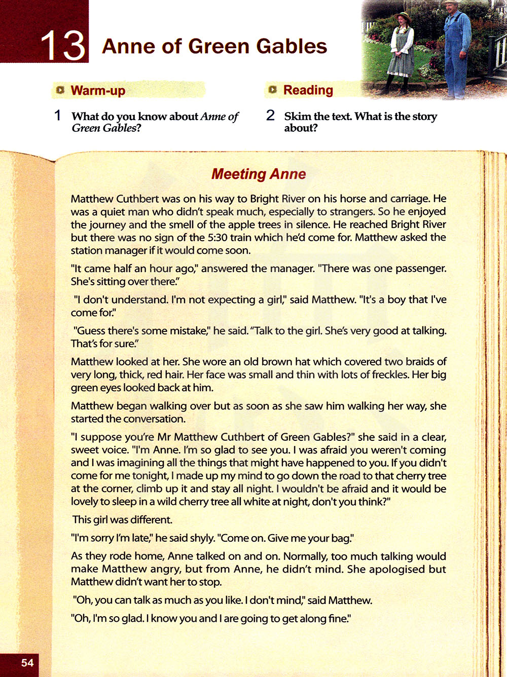 马修·卡斯伯特骑着马和马车去了布莱特河。他是一个安静的人,很少说话,尤其是对陌生人。因此,他默默的享受着这段旅程和苹果树的香味。他来到布莱特河,却找不到五点半那趟火车的踪迹马修问电台经理是否会很快到来。