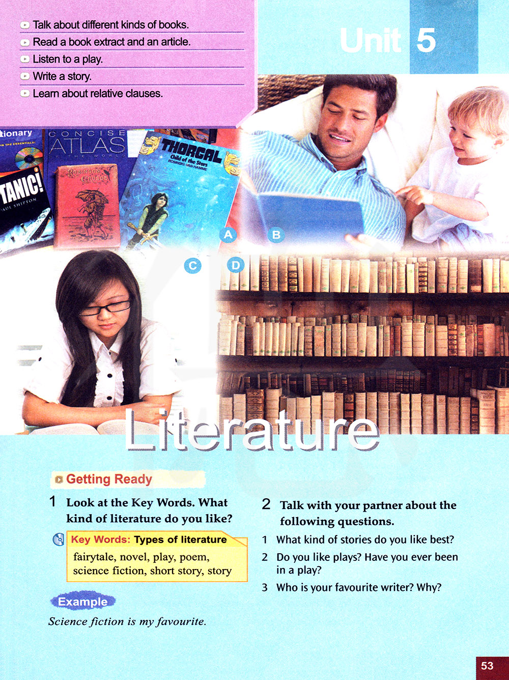 谈论不同的书籍。 阅读一本书的选段和一篇文章。 听一部戏剧。
