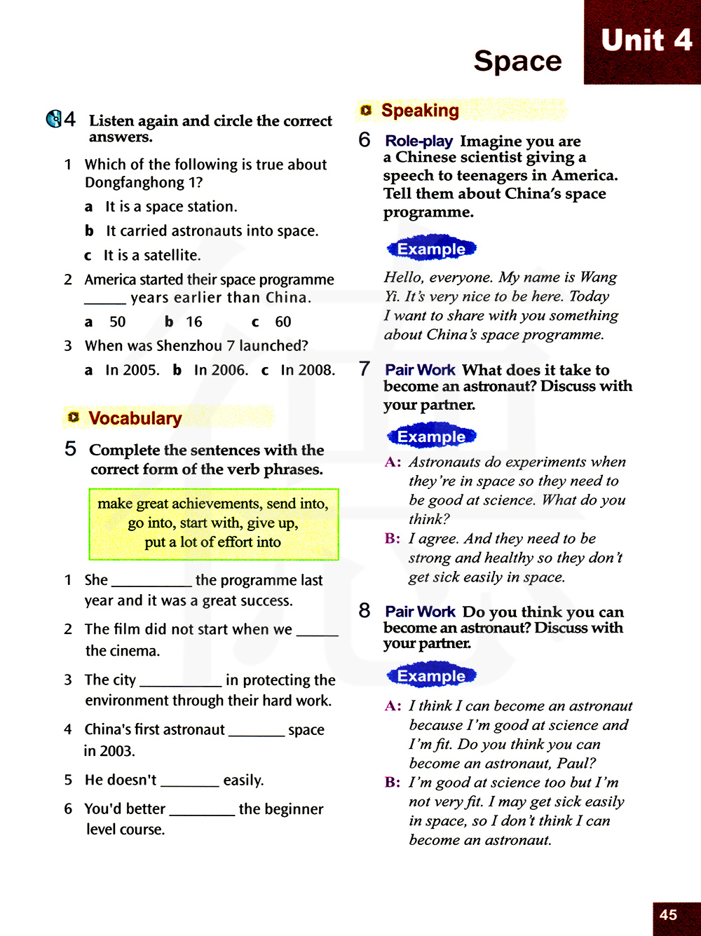 例子 我认为我能成为一名宇航员,因为我很擅长科学而且我很健康。保罗,你认为你能成为一名宇航员吗? 我也很擅长科学,但是,我不是非常健康。我在太空可能很容易生病,所以,我认为我不能成为一名宇航员。