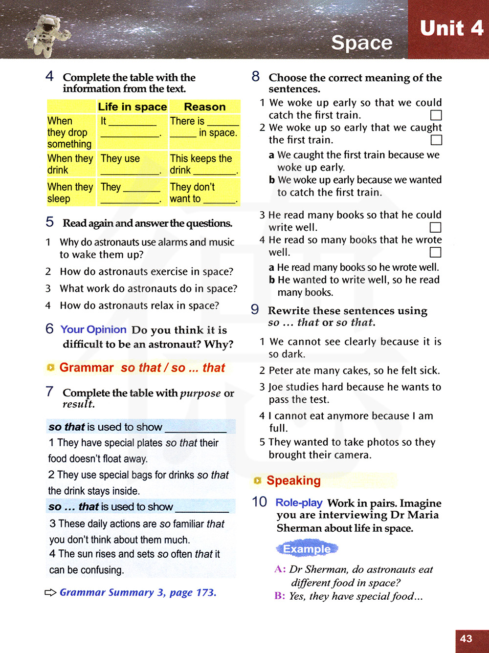 口语 两人一组进行角色扮演。想象一下,你正在采访玛利亚·谢尔曼博士关于太空生活的问题。