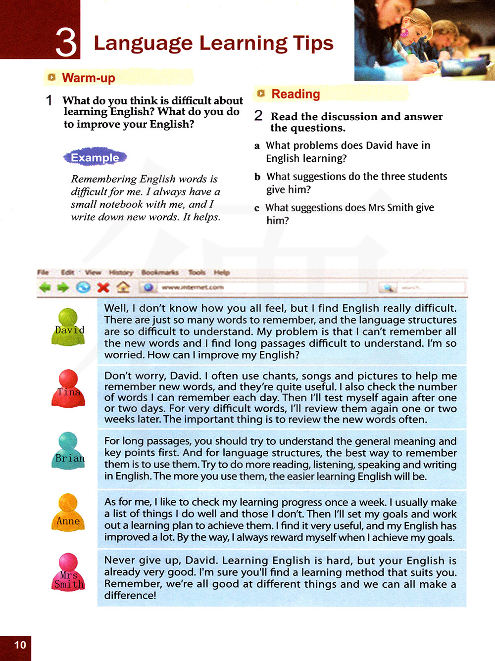 蒂娜 别担心,大卫。我经常用歌曲,歌曲和图片来帮助我记住新单词,它们非常有用。我还会检查我每天能记住的单词数量。然后我将在一到两天之后再次测试自己。对于很难的单词,我会在一两周后再复习一遍。重要是经常复习新单词。
