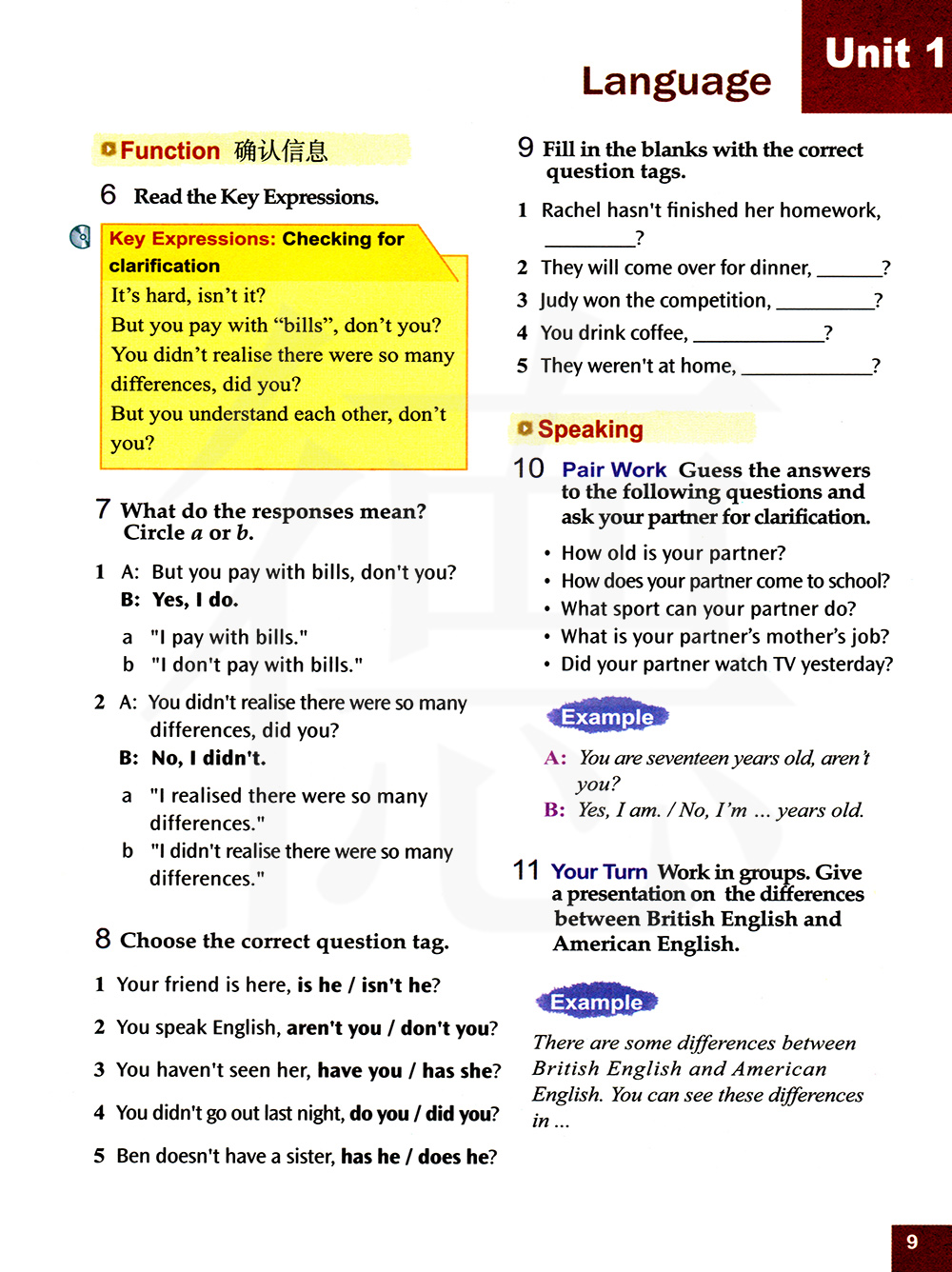 关键表达:确认信息 很难,是吗? 但是你付了账单,是吗? 你没有意识得到有这么多不同,是吗? 但是你们相互理解,是吗?