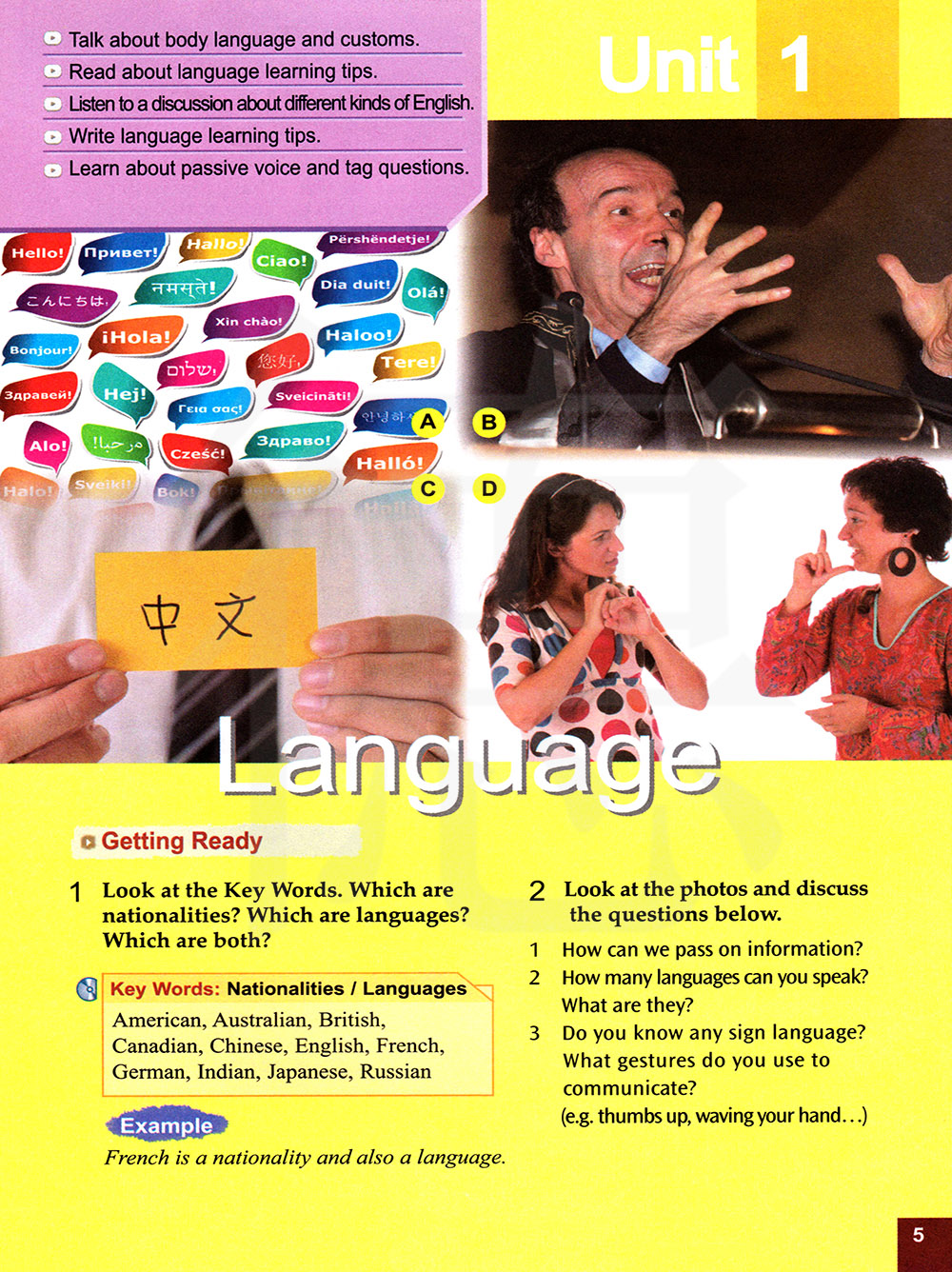 谈论肢体语言和习俗。 读一读语言学习小贴士。 听一个关于不同种类英语的讨论。