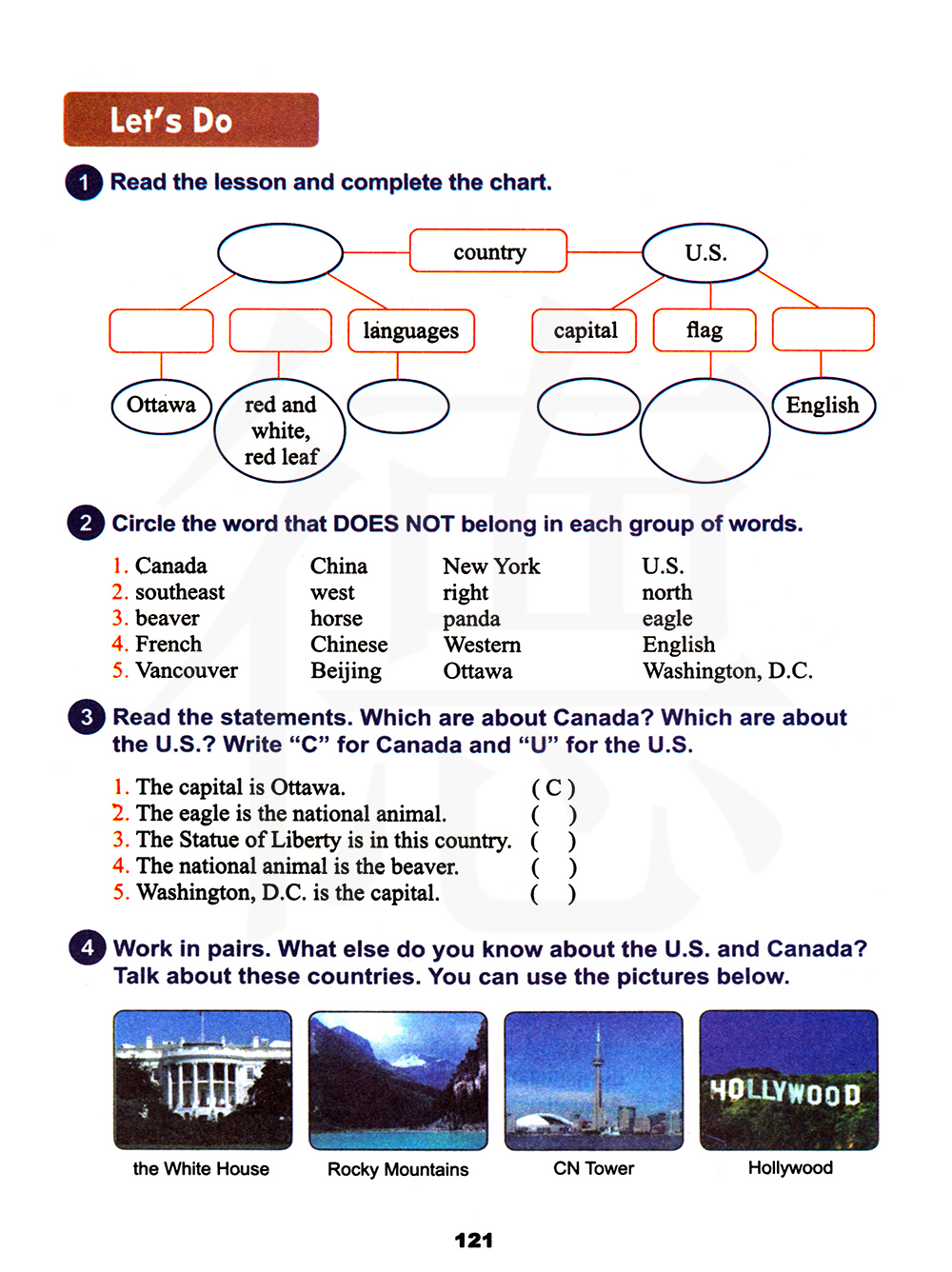 1、加拿大、中国、纽约、美国 2、东南、西方、对,右边、北方 3、海狸、马、熊猫、鹰