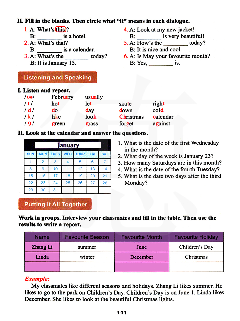 例如:我的同学喜欢不同的季节和假期。张丽喜欢夏天。她喜欢在儿童节那天去公园。儿童节是在六月一号。琳达喜欢十二月。她喜欢看漂亮的圣诞灯。