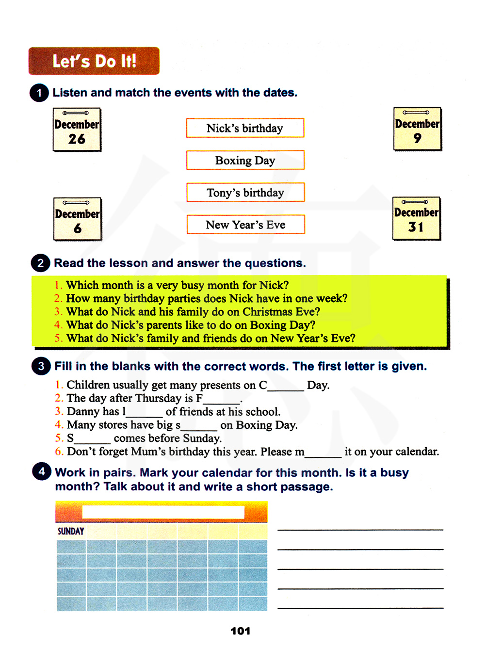 两人一组练习。为这个月标记你的日历。这是一个繁忙的月份吗?谈论它并写一段短文。