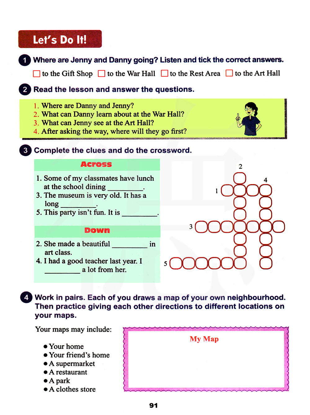 3、在艺术大厅,詹妮可以看到什么? 4、问过路后,他们首先要去哪里?
