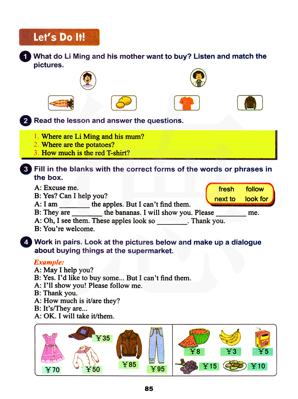 1、李明和她妈妈在哪里? 2、土豆在哪里? 3、红色T恤衫多少钱?