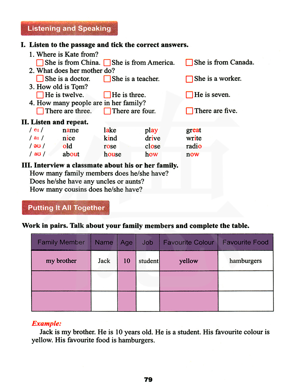 3、汤姆多大了?他十二岁。他三岁。他七岁。 4、她的家庭成员有多少人?有三个。有四个。有五个。