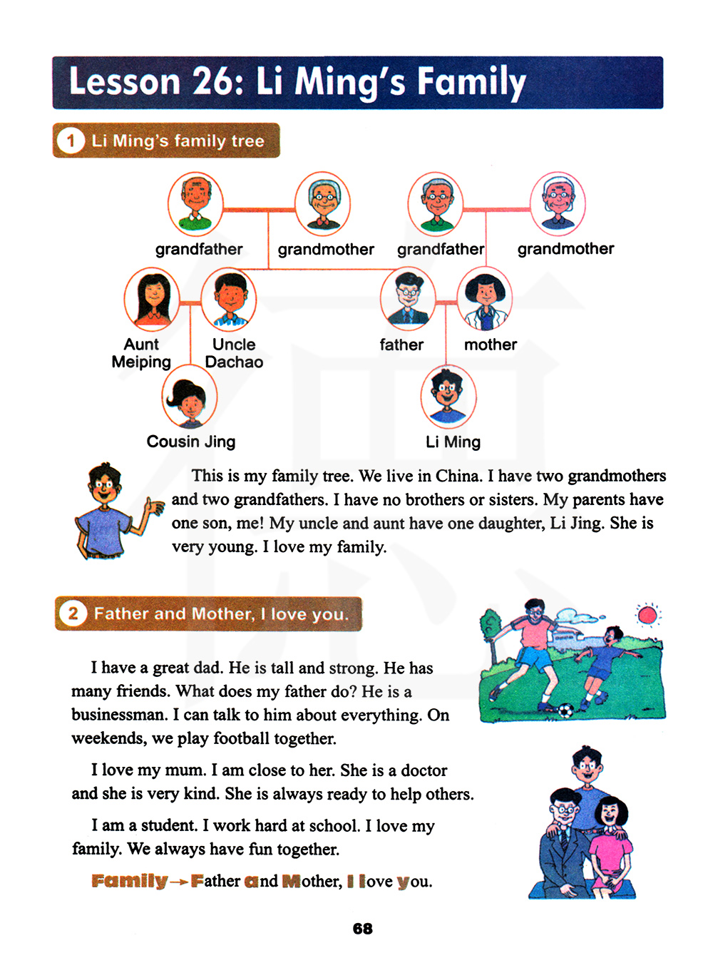 这是我的家谱。我们生活在中国。我有祖父母和外祖父母。我没有兄弟姐妹。我的父母只有一个儿子,我!我的叔叔和婶婶有一个女儿,李静。她很年轻。我爱我的家人。