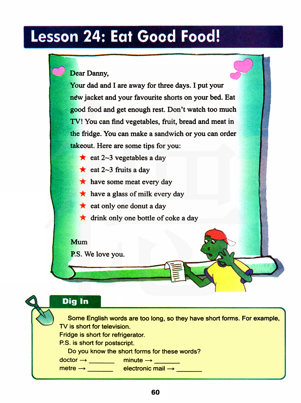 你爸爸和我要离开三天。我把你的新夹克和你最喜欢的短裤放在你的床上。吃健康的食物并保证休息充足。不要看太多电视!你可以在冰箱里找到蔬菜、水果、面包和肉。你可以做一个三明治或者叫外卖。这是给你的一些小贴士: