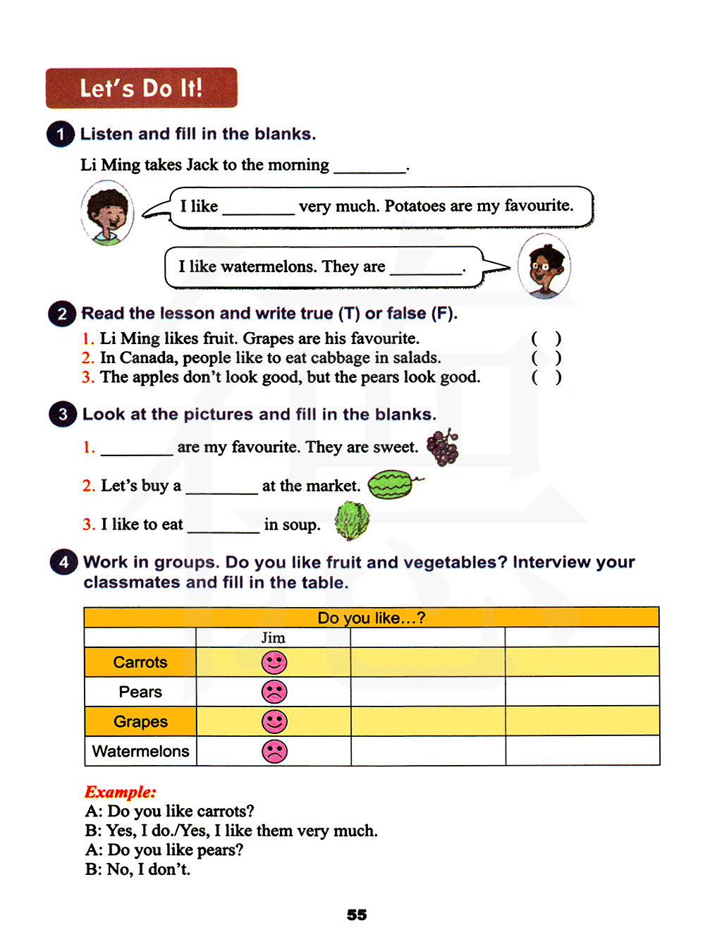 分组练习。你喜欢水果和蔬菜吗?采访你的同学并填表格。