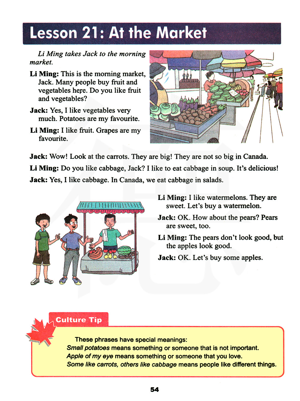 李明:这是早市,杰克。许多人在这里买水果和蔬菜。你喜欢水果和蔬菜吗? 杰克:是的。我非常喜欢蔬菜。土豆是我最喜欢的。
