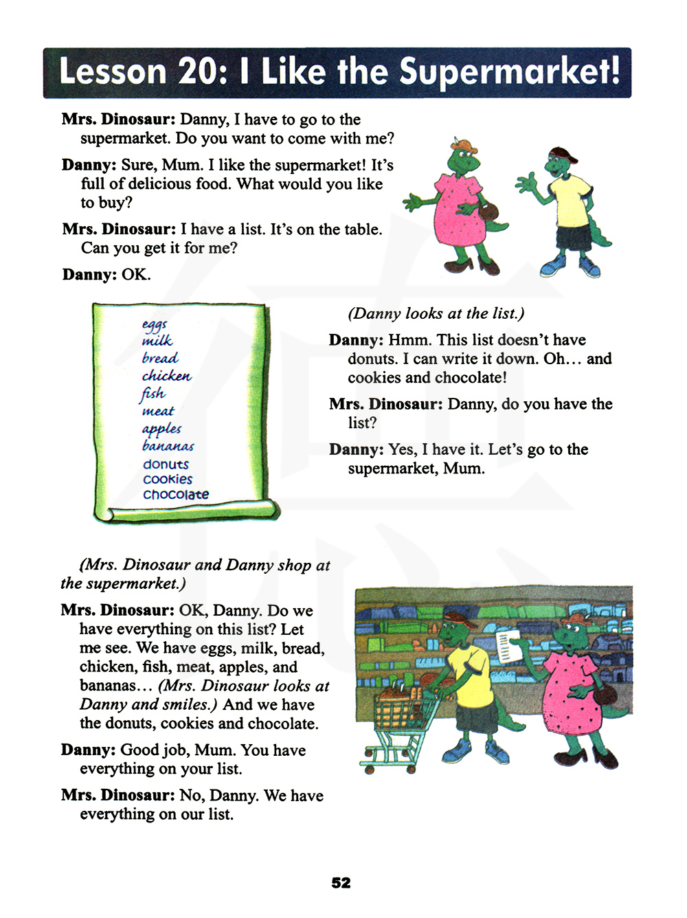 丹尼:干的好,妈妈。你买了清单上所有的东西。 恐龙太太:不,丹尼。是我们买了我们清单上所有的东西。