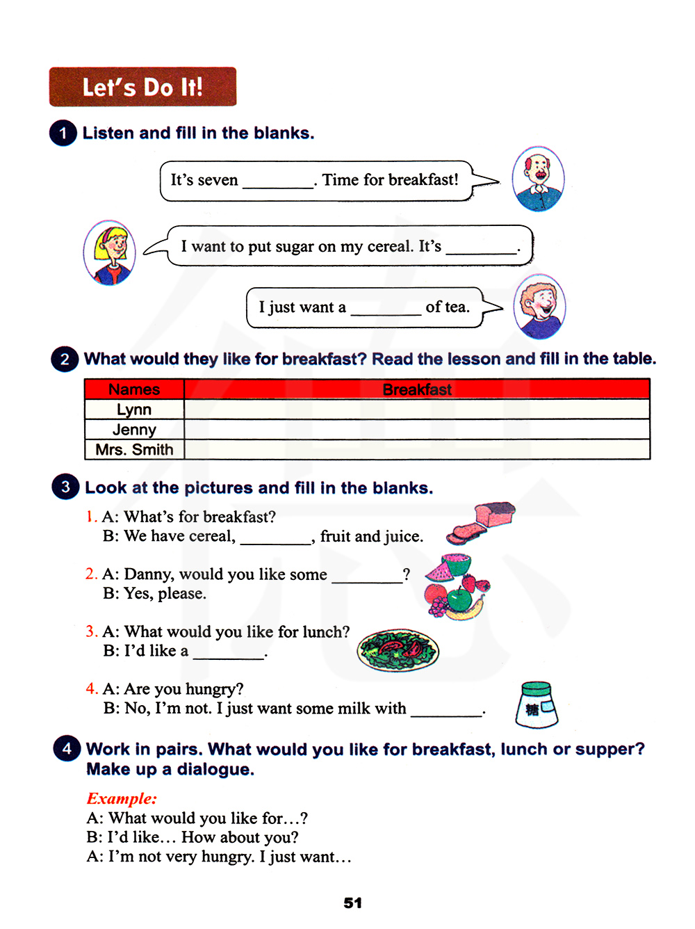 他们早餐通常吃什么?读这篇文章并填表格。