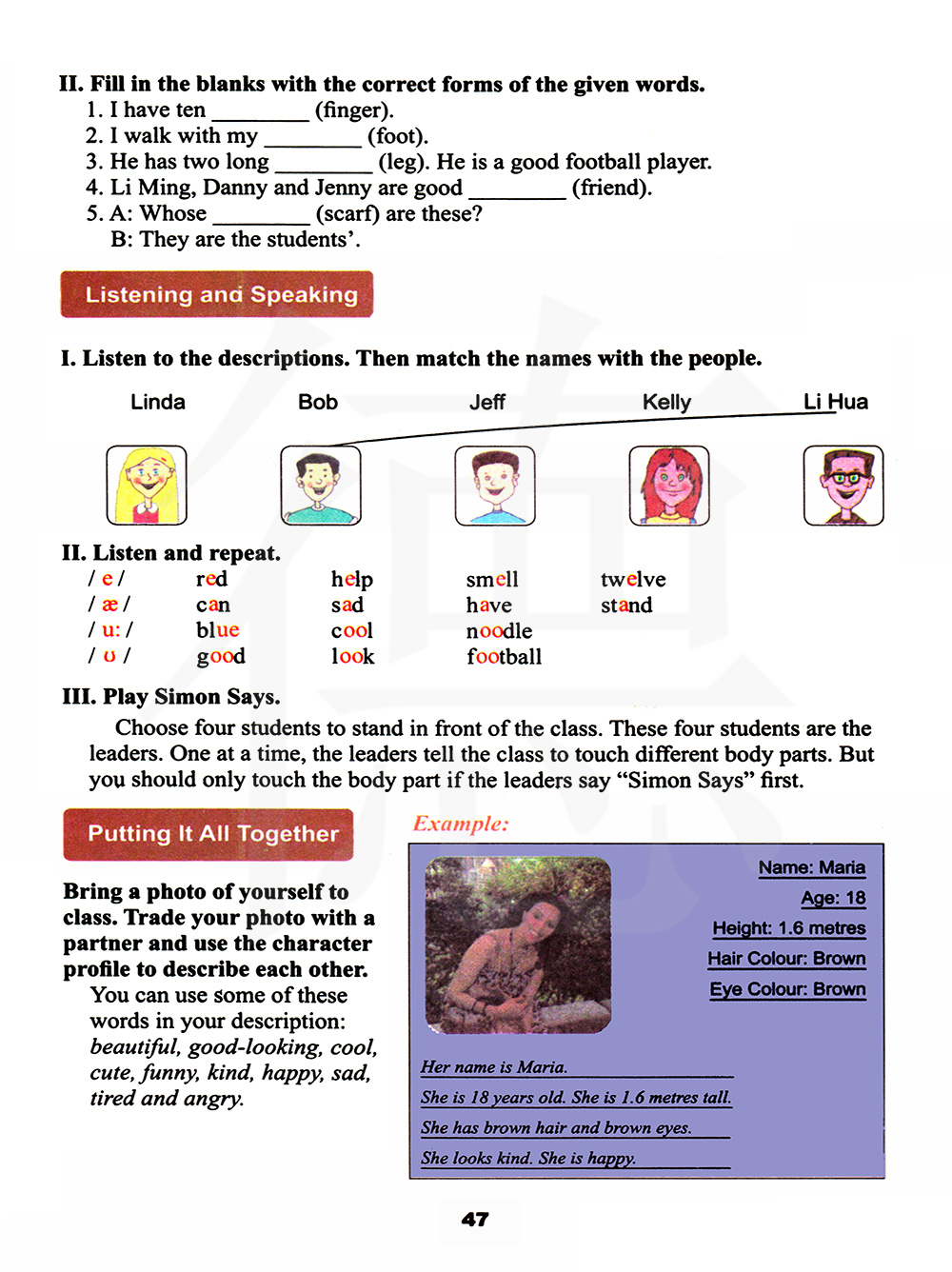 你可以在你的描述中用这些词:漂亮的,好看的,酷的,可爱的,有趣的,友善的,快乐的,悲伤的,累的和生气的。