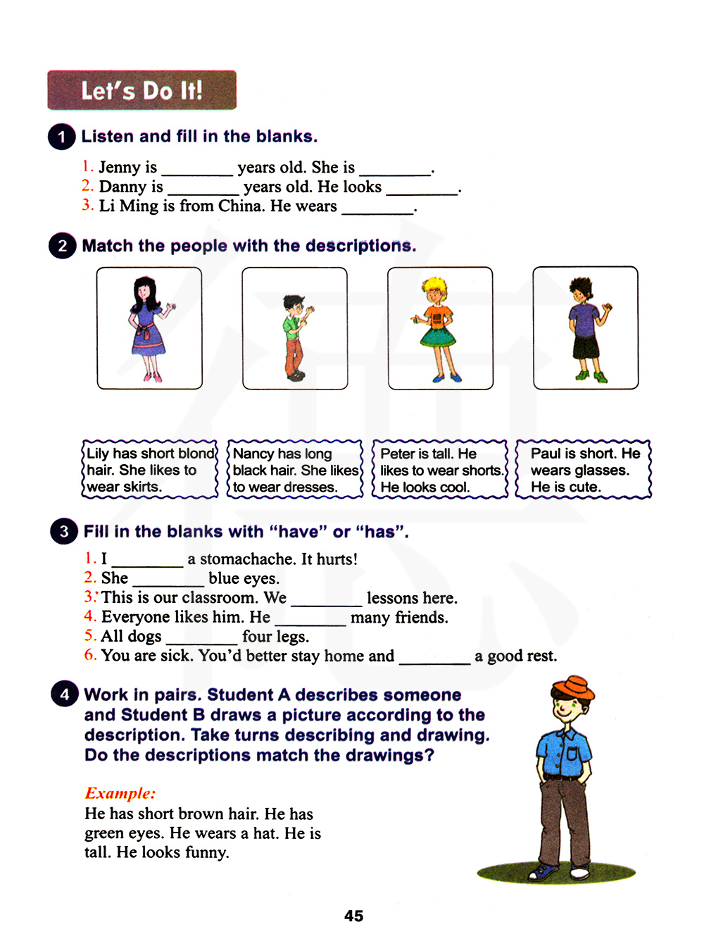 例如:他有一头短的棕发。他有绿色的眼睛,他戴着一顶帽子。他很高。他看起来很有趣。