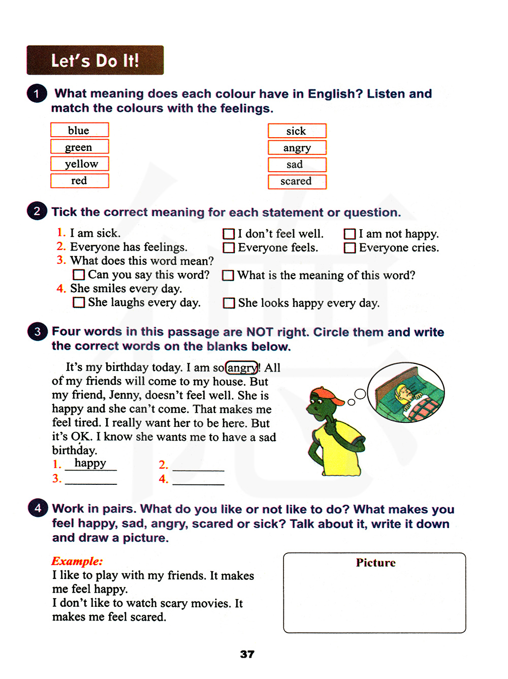 两人一组练习。你喜欢做什么或不喜欢做什么?什么让你感到开心,难过,生气,害怕或呕心?谈论它,写下它并话一幅图画。