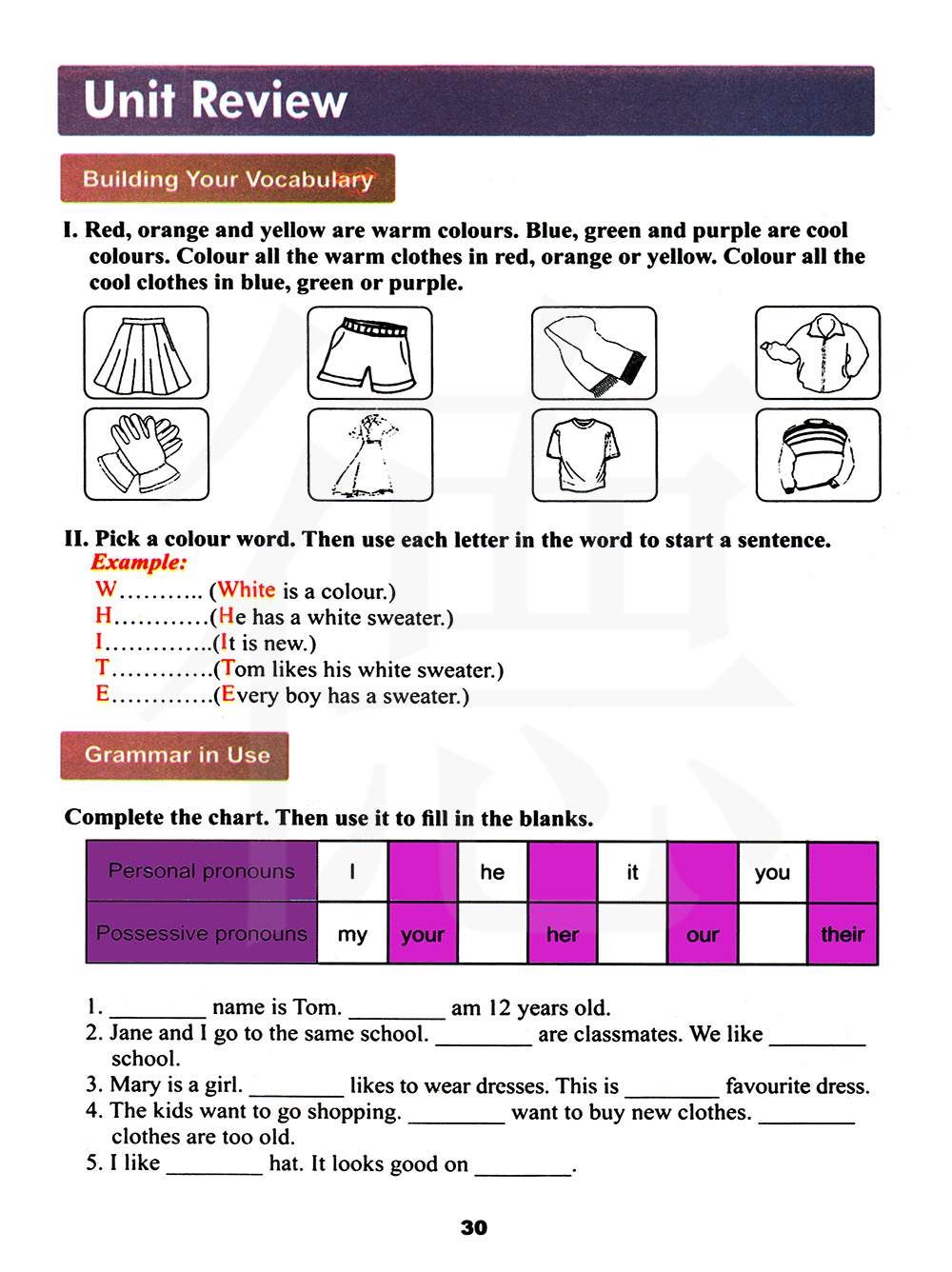 红色,橙色和黄色是暖色。蓝色,绿色上紫色是冷色。给所有暖和的衣服涂上红色,橙色或黄色。给所有凉爽的衣服涂上蓝色,绿色或紫色。