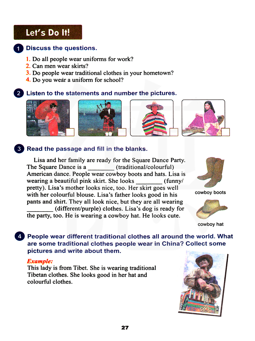 3、你家乡的人穿传统服装吗? 4、你穿校服上学吗?
