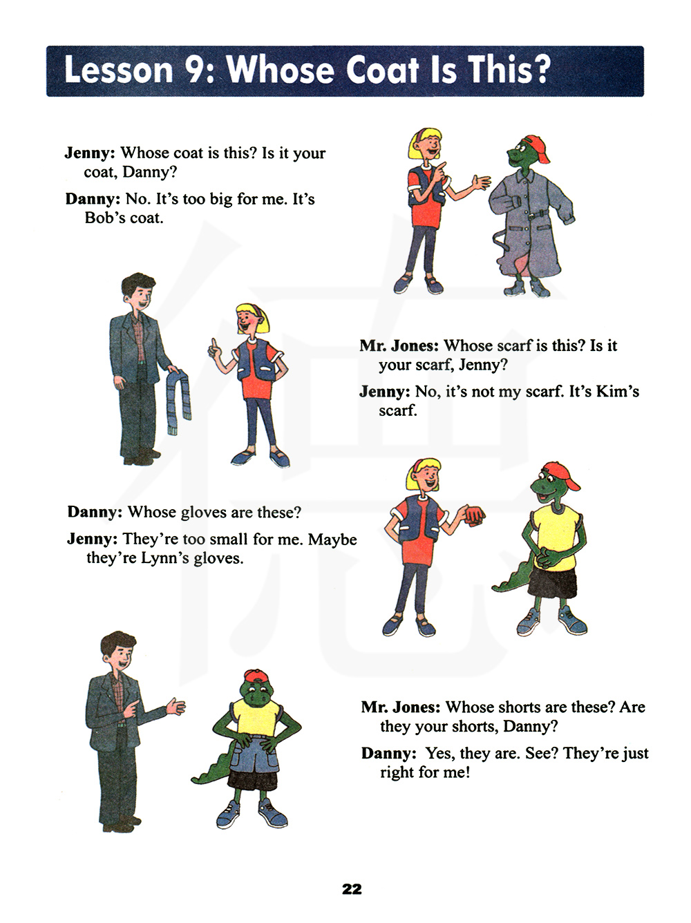 琼斯先生:这是谁的围巾?詹妮,这是你的围巾吗? 詹妮:不,这不是我的围巾。这是金的围巾。
