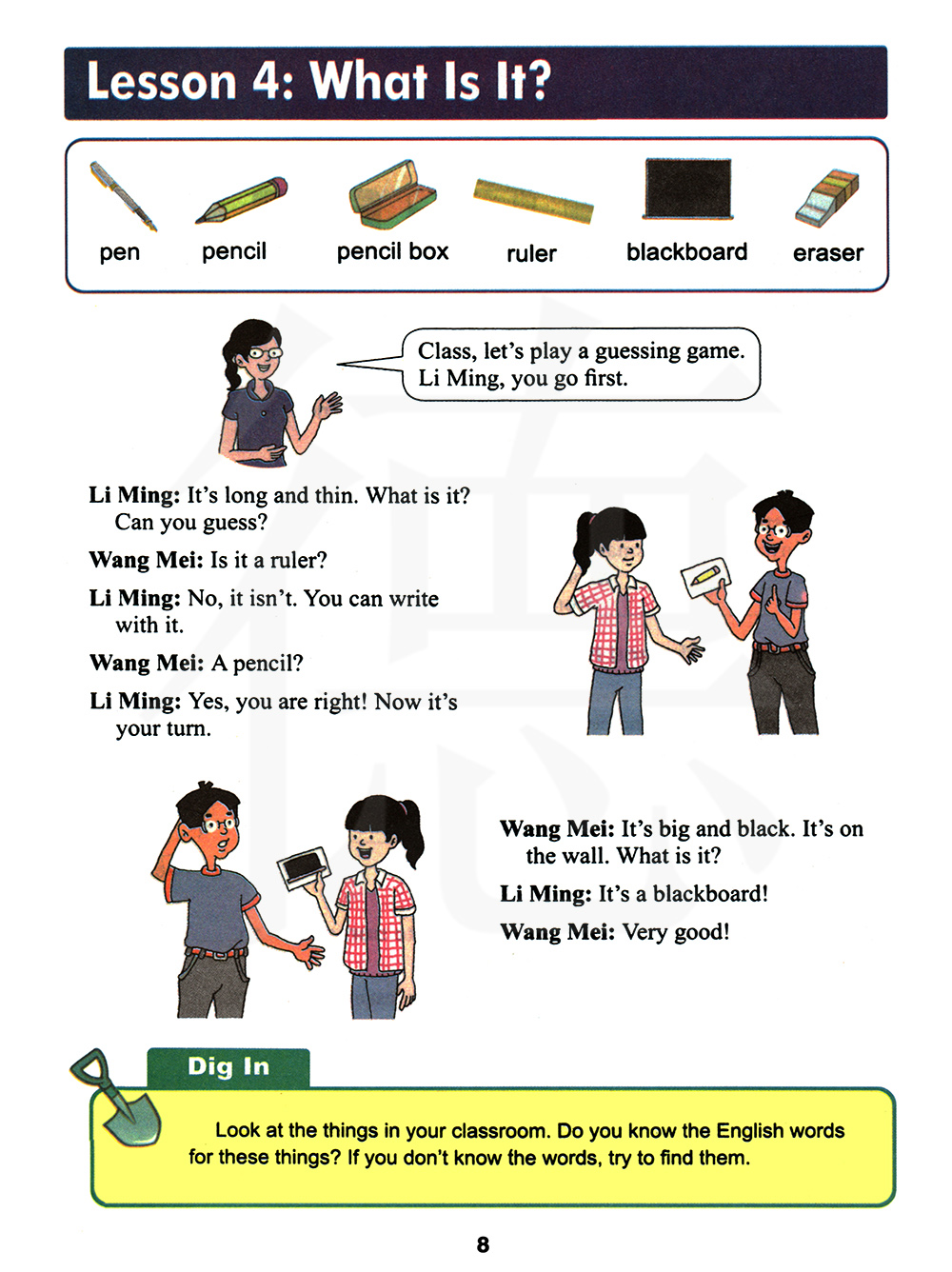 王梅:它又大又黑。它在墙上。它是什么? 李明:它是黑板! 王梅:很好!
