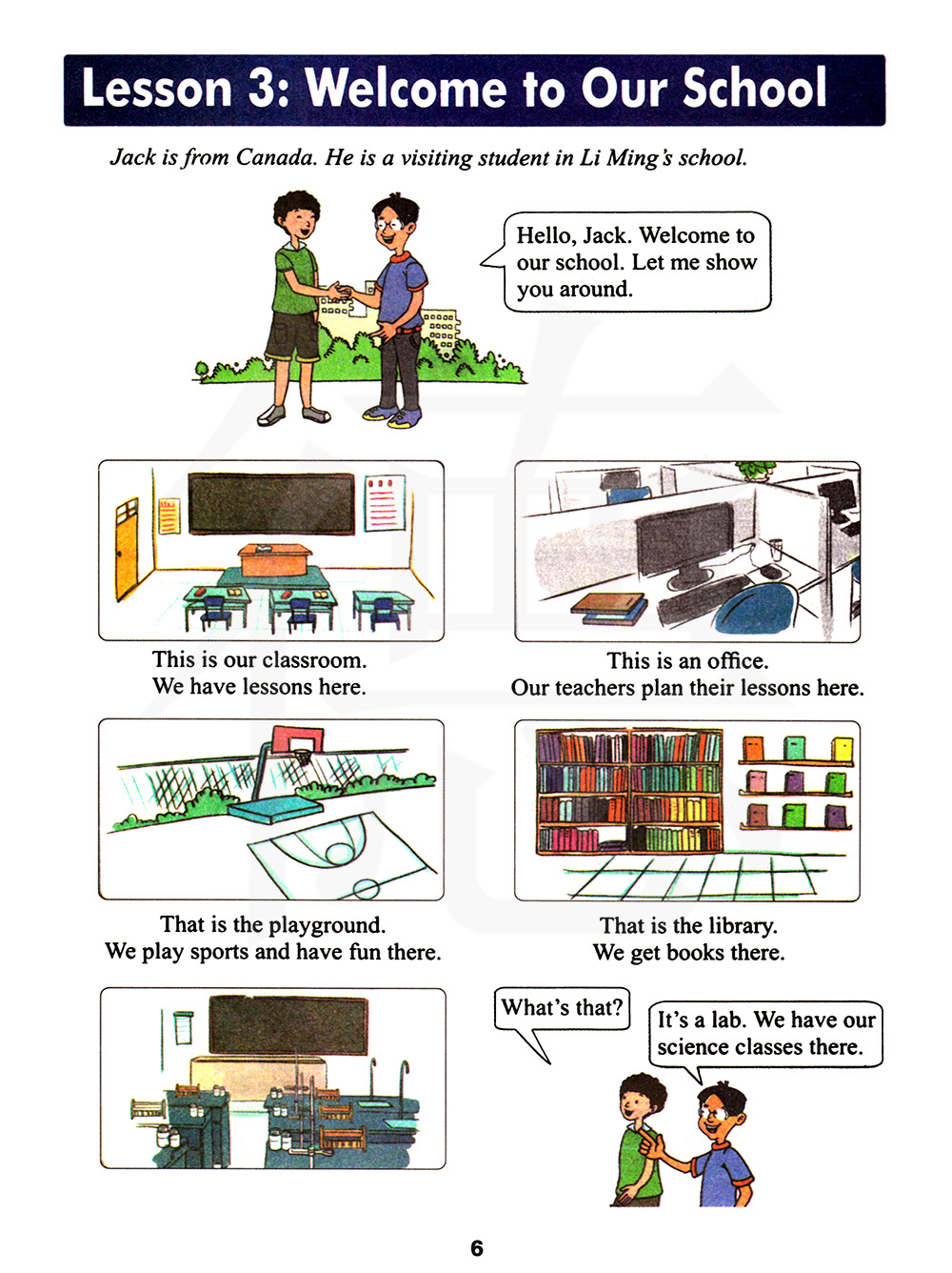 你好,杰克。欢迎来我们的学校。让我带你四处逛逛吧。