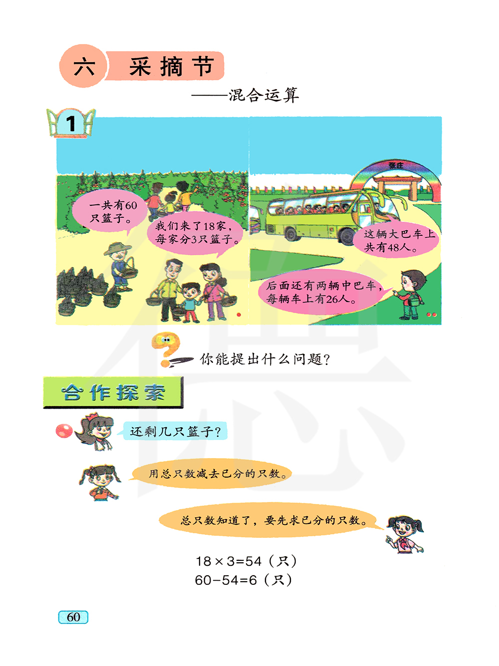 学生已经知道:算式里有乘法和加、减法,应先算乘法;算式里有除法和加、减法,应先算除法;算式里有括号,应先算括号里面的。在此基础上,本单元继续教学混合运算,算式里都有三个运算符号。结合运算教学,在“想想做做”里还安排了许多需要两、三步计算的实际问题。加强在没有括号的算式里或算式的小括号里都要先算乘、除法的认识。