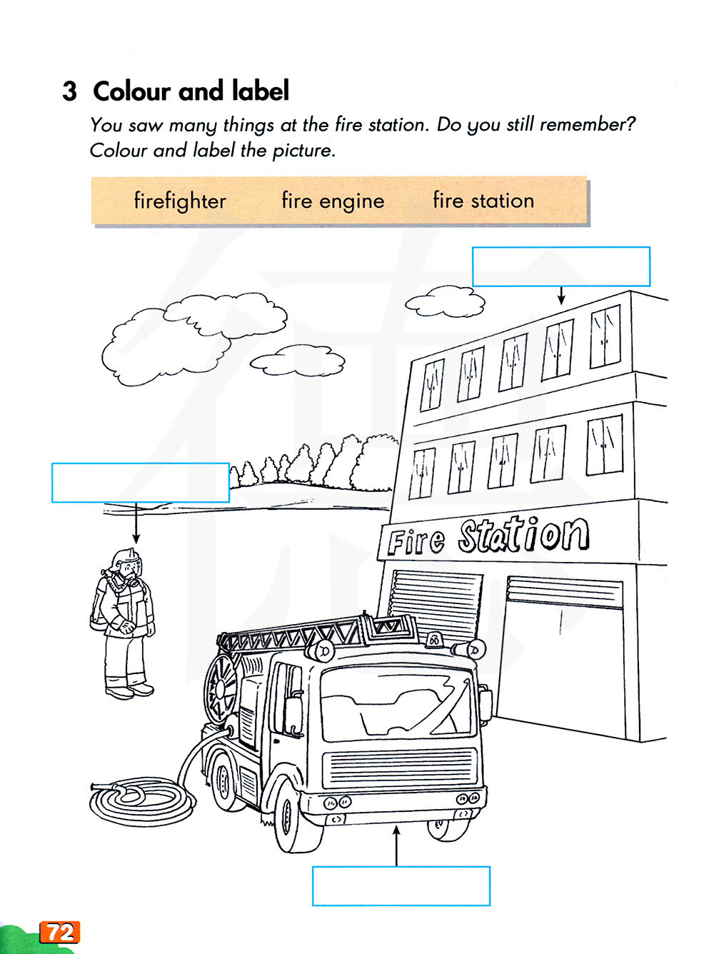 你在消防站看到了很多东西。你还记得吗?在图片上涂上颜色并且标志出来。