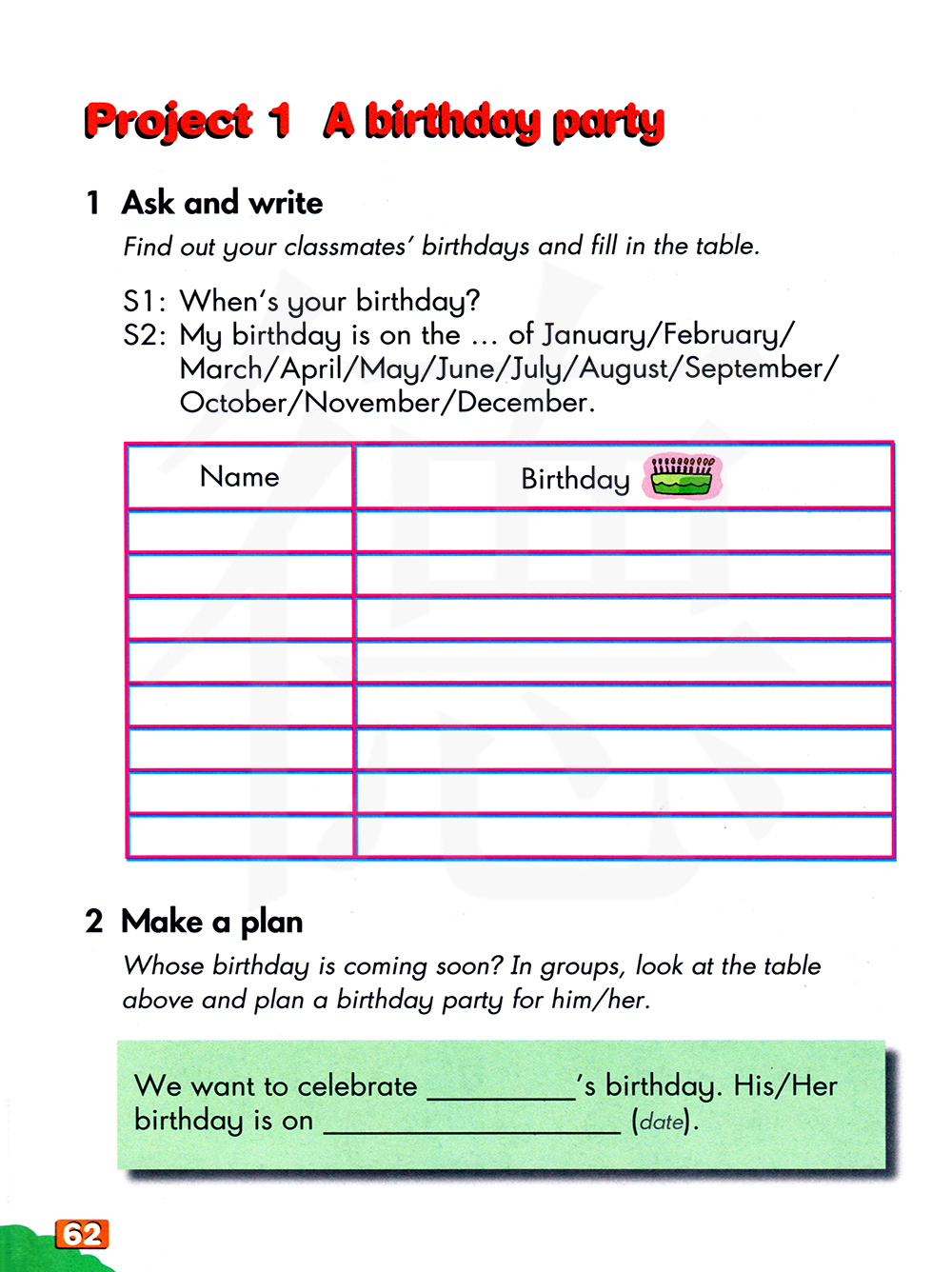 谁的生日快到了?以小组为单位,看看上面的表格并且为他/她计划一个生日聚会。