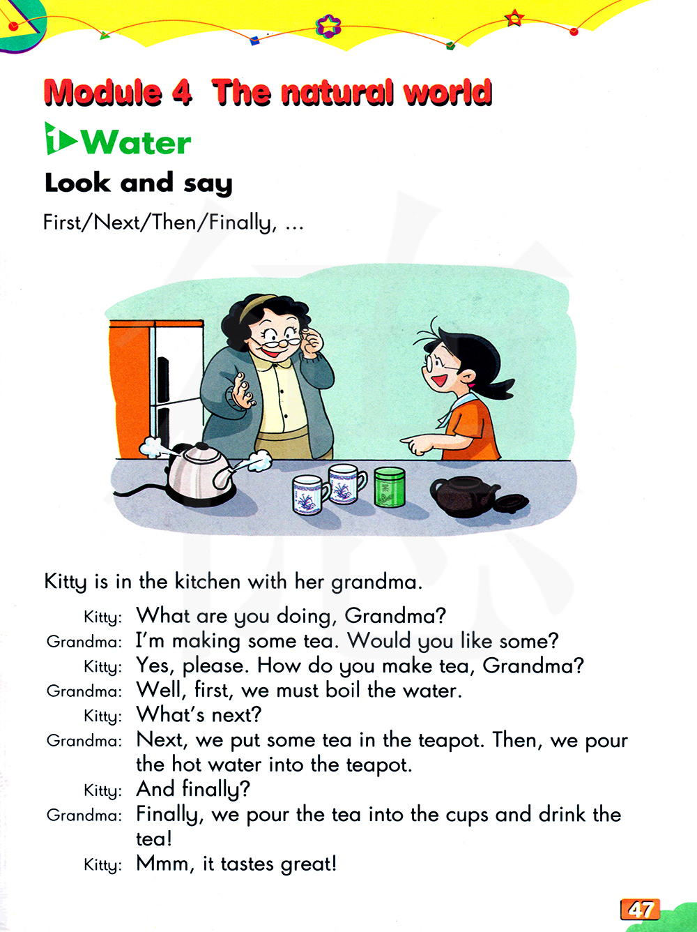 基蒂:是的,请。奶奶,你是怎么泡茶的? 奶奶:嗯,首先,我们必须把水烧开。