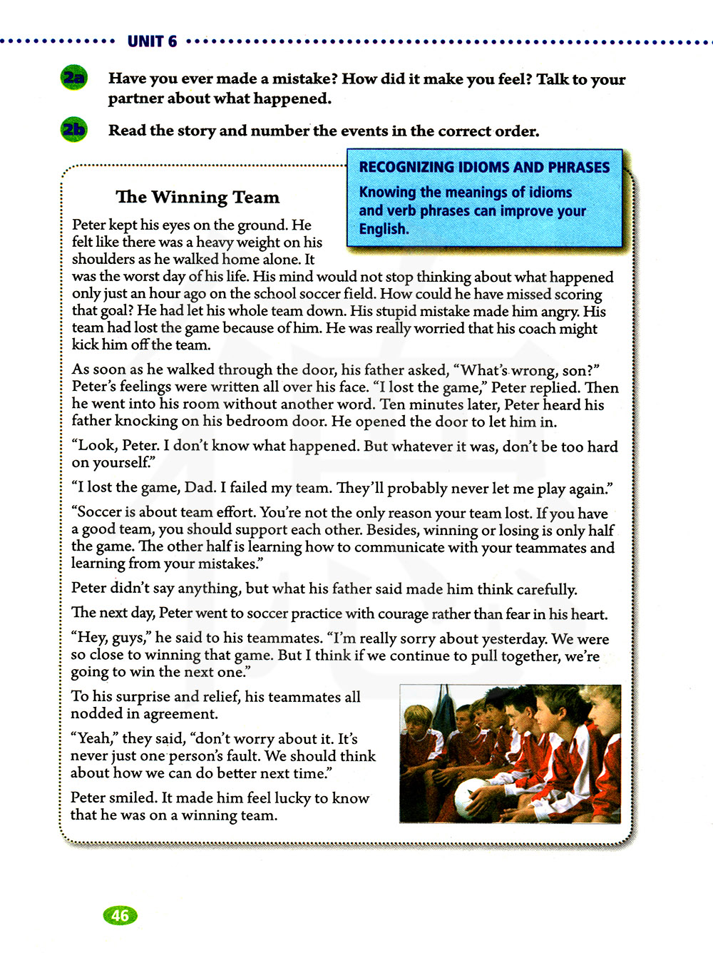 彼得什么也没说,但是他父亲说的话让他很认真的想了想。 第二天,彼得并没有害怕,而是勇敢地去参加足球训练。