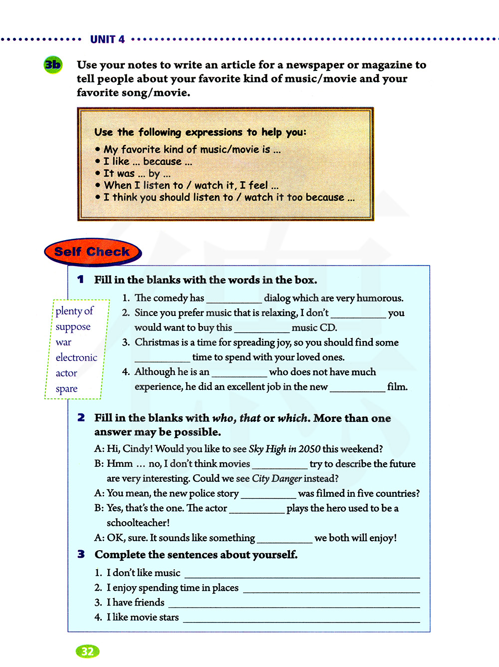 使用你的笔记来为报纸或杂志写一篇文章,告诉人们你最喜欢的音乐类型/电影类型以及你最喜欢的歌曲/电影。