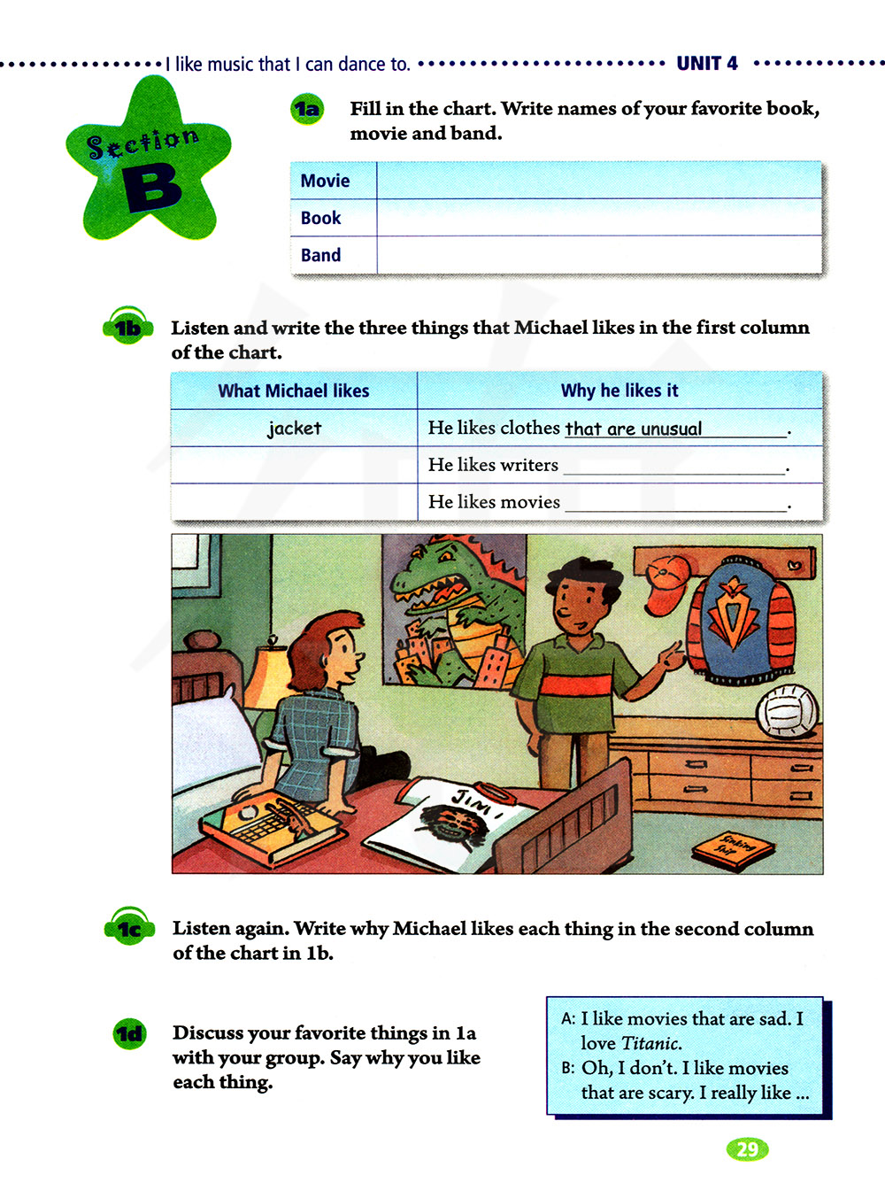 再听一遍,在1b的表格中的第二栏写下迈克尔喜欢每件事物的原因。