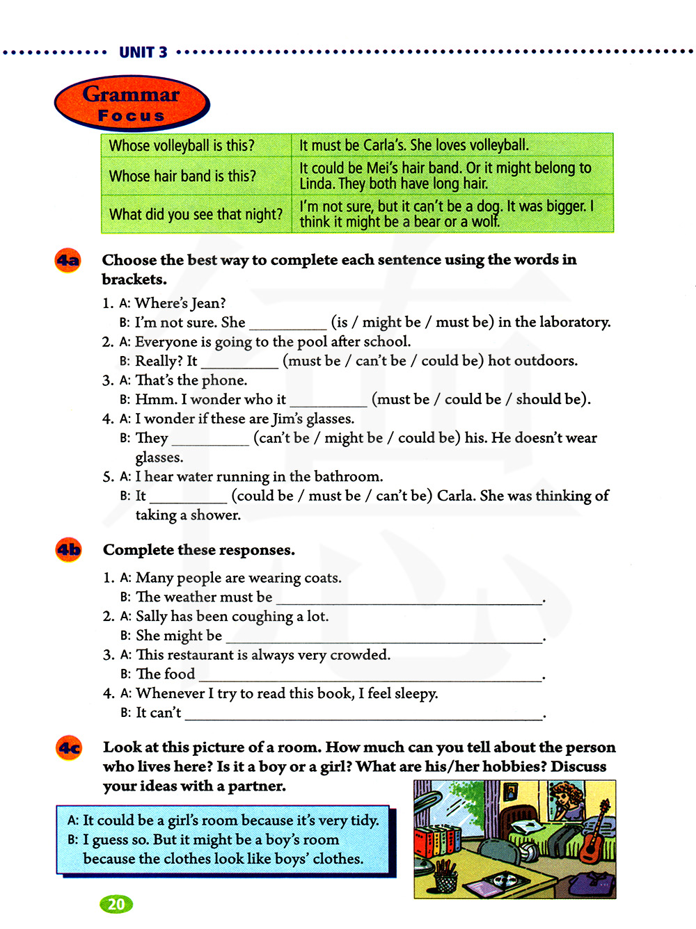 看这幅一个房间的图片,对于住在这里的人你能谈论多少?这是一个男孩还是一个女孩?他(她)的兴趣爱好是什么?和你的同伴讨论你的想法。