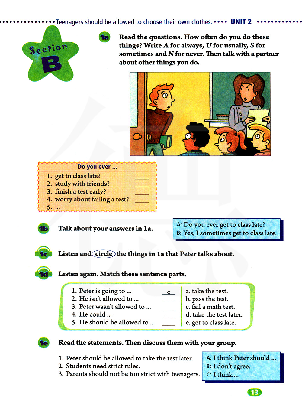 读这些句子。你多久做一次这些事情。如果是“总是”,写A,通常写U,有时写F,从不写N,然后和同伴们讨论你做的其他事情。