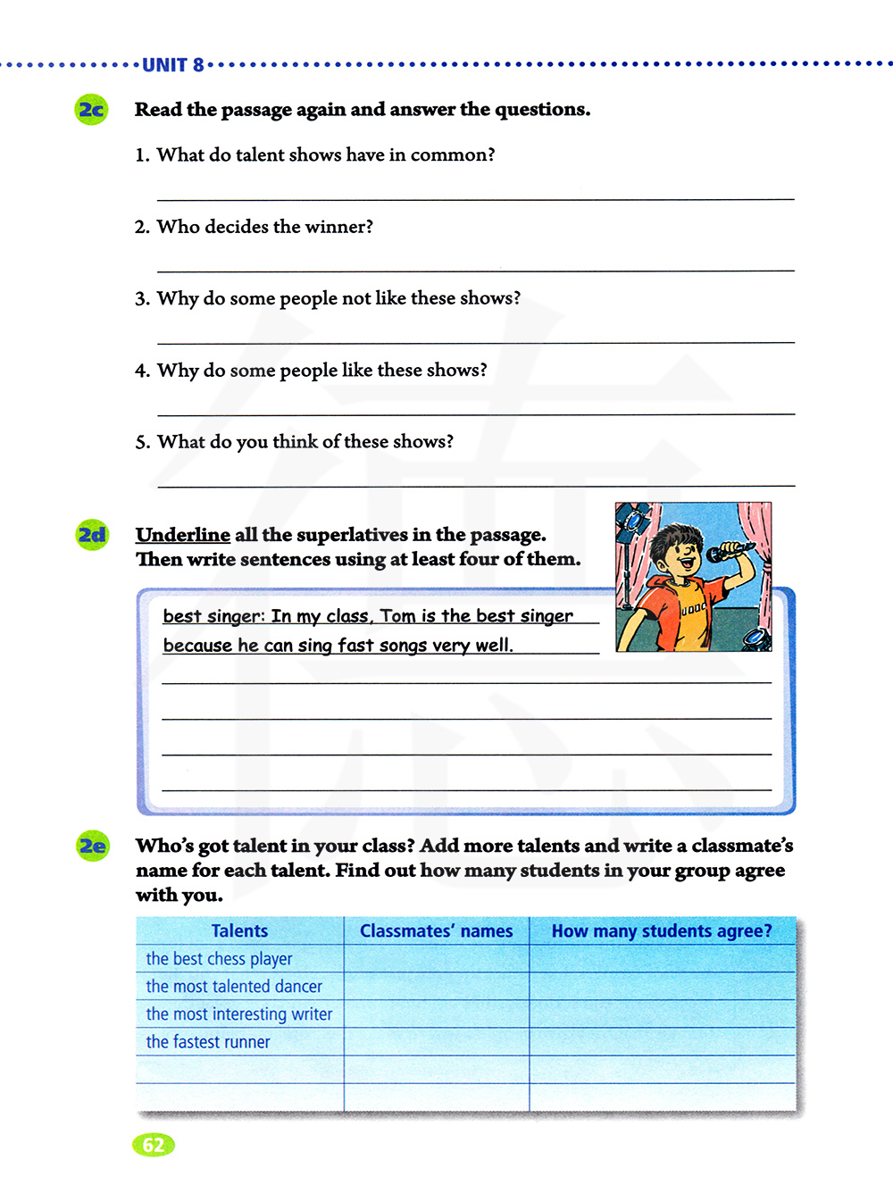 最佳歌手:在我班上,汤姆是最佳歌手,因为他可以唱的很好。