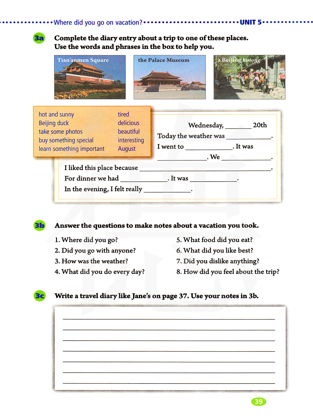 写一本旅行日记,就像37页上的简的日记。用你的笔记在3B。