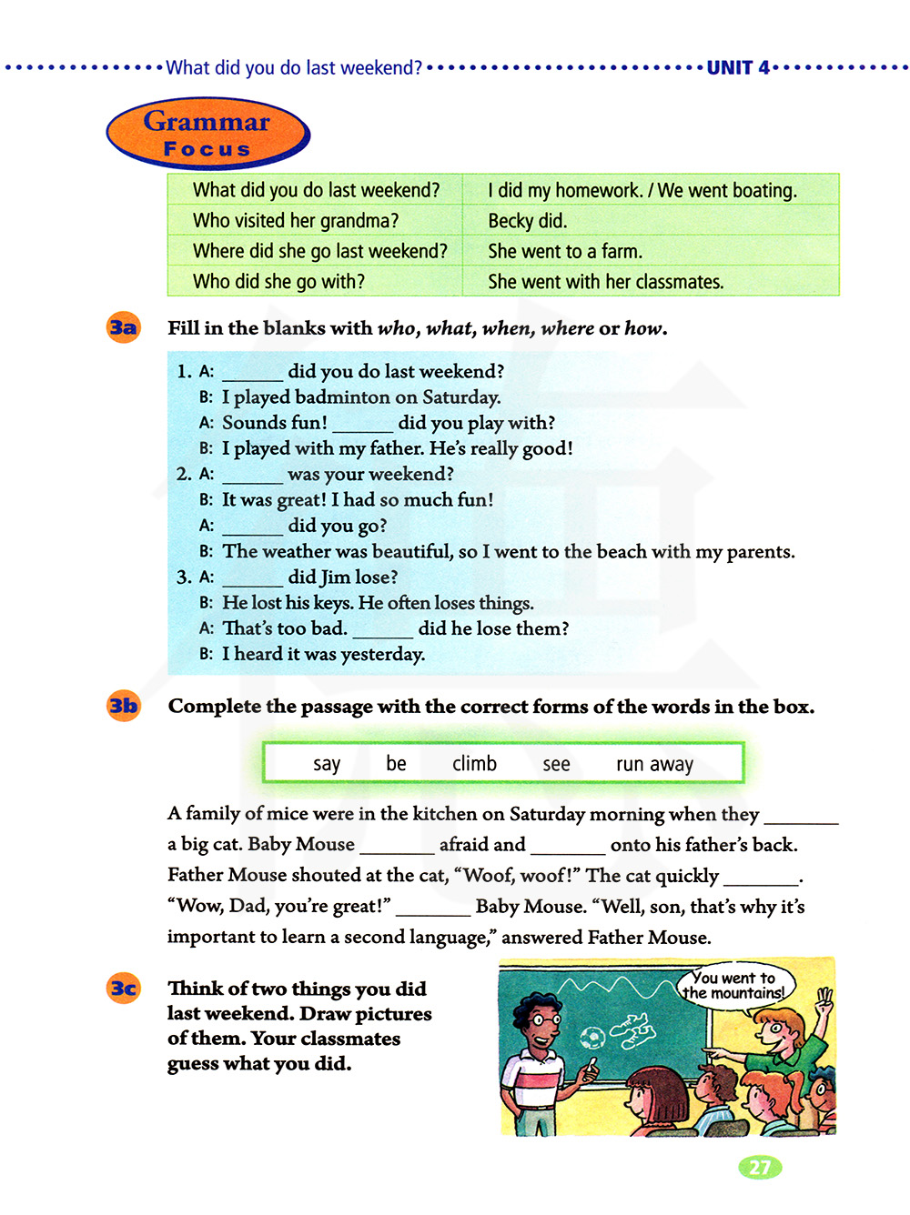想想你上周末做的两件事。画他们的照片。你的同学猜你做了什么。