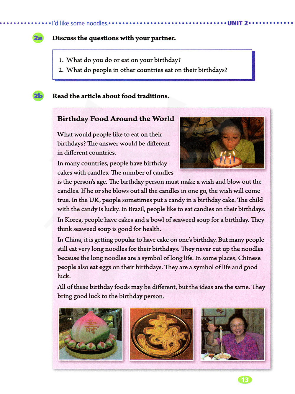 在许多国家,人们都有带蜡烛的生日蛋糕。蜡烛的数量是这个人的年龄。过生日的人必须许个愿,吹灭蜡烛。如果他或她把所有的蜡烛都吹灭了,愿望就会实现。在英国,人们有时会在生日蛋糕上放糖果。带着糖果的孩子是幸运的。在巴西,人们喜欢在生日时吃糖果。在韩国,人们有蛋糕和一碗海藻汤作为生日礼物。他们认为海藻汤对健康有好处。
