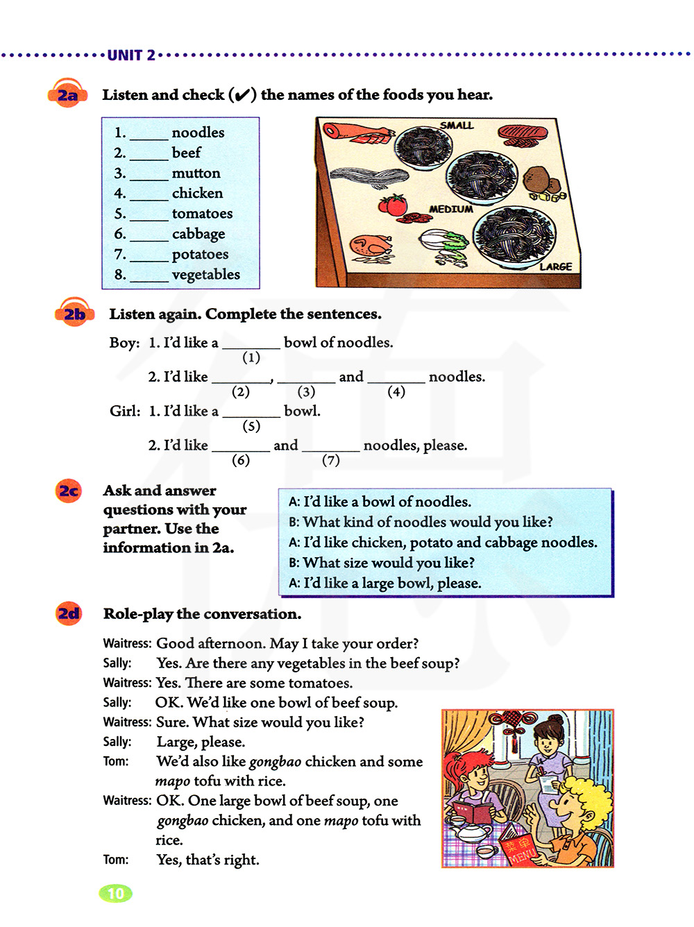 我想要有鸡肉,土豆和卷心菜的面条。我想要一碗面条。你想要什么样的面条?