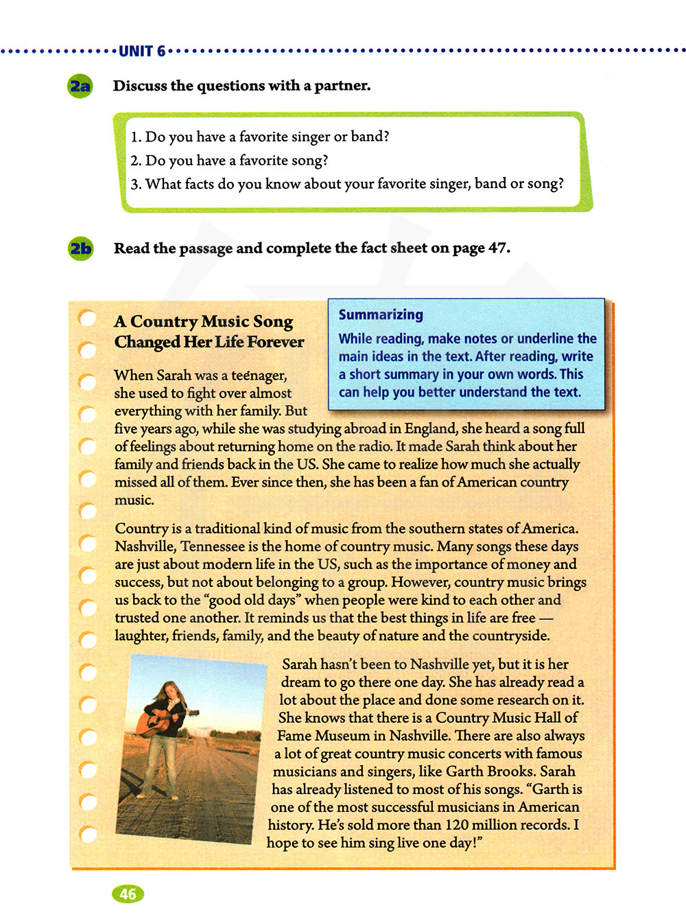 萨拉还没有去过纳什维尔,但有一天她会去那里是她的梦想。她已经读了很多关于这个地方的书,并在那里做了一些储备。她知道在纳什维尔有一个乡村音乐名人博物馆,也总是有许多伟大的乡村音乐音乐会与著名的音乐家和歌手,莎拉已经听过他的大部分歌曲。加斯是美国历史上最成功的音乐家之一。莎拉已经听过他的大部分歌曲。加斯是美国历史上最成功的音乐家之一。