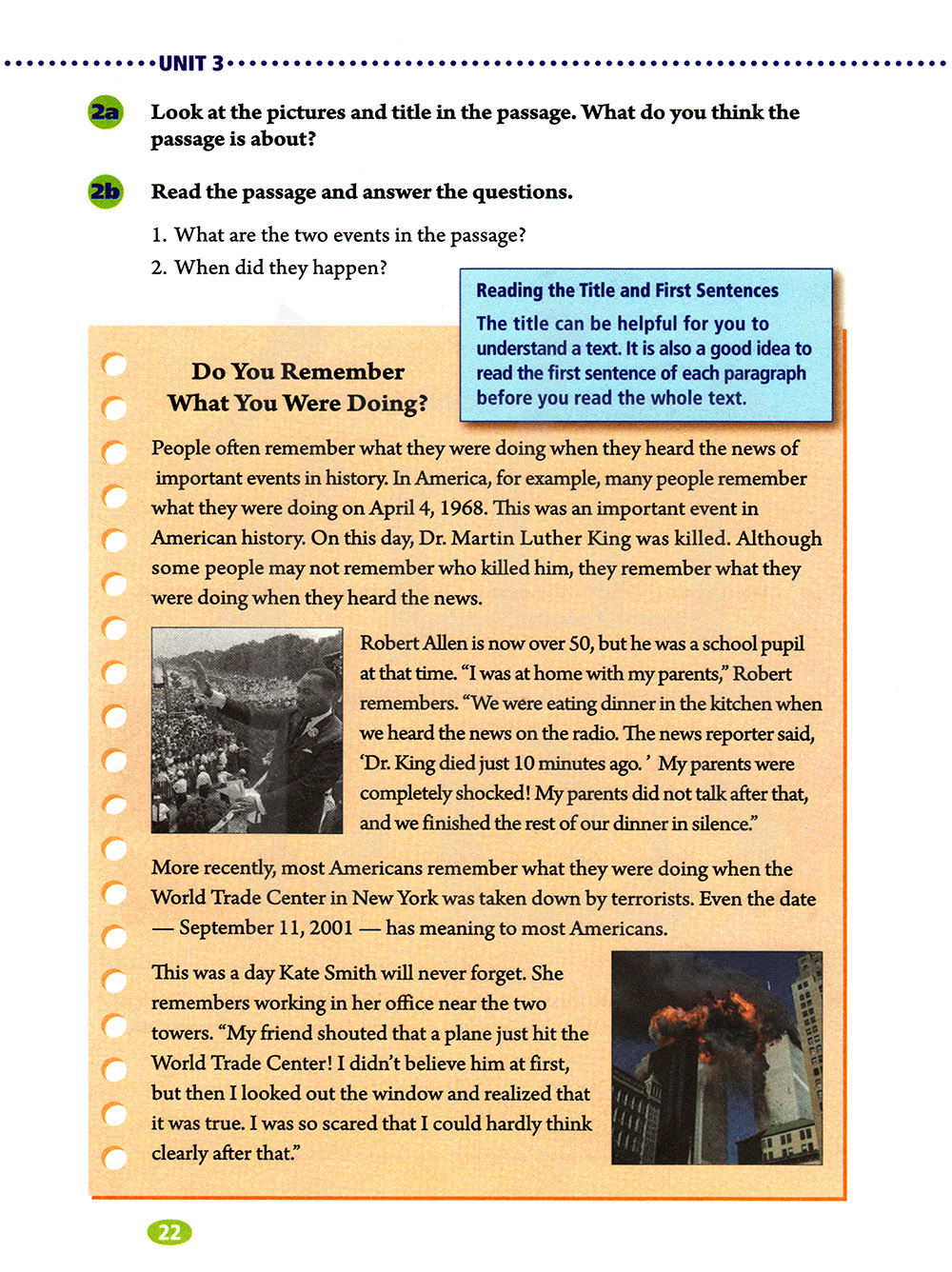 当人们听到历史上重要事件的消息时,常常会想起他们在做什么。例如,在美国,许多人记得他们在1968年4月4日所做的事情。这是美国历史上的一件大事。这一天,马丁路德金博士被杀了。虽然有些人可能不记得是谁杀了他,但他们记得当他们听到这个消息的时候,他们正在做什么。