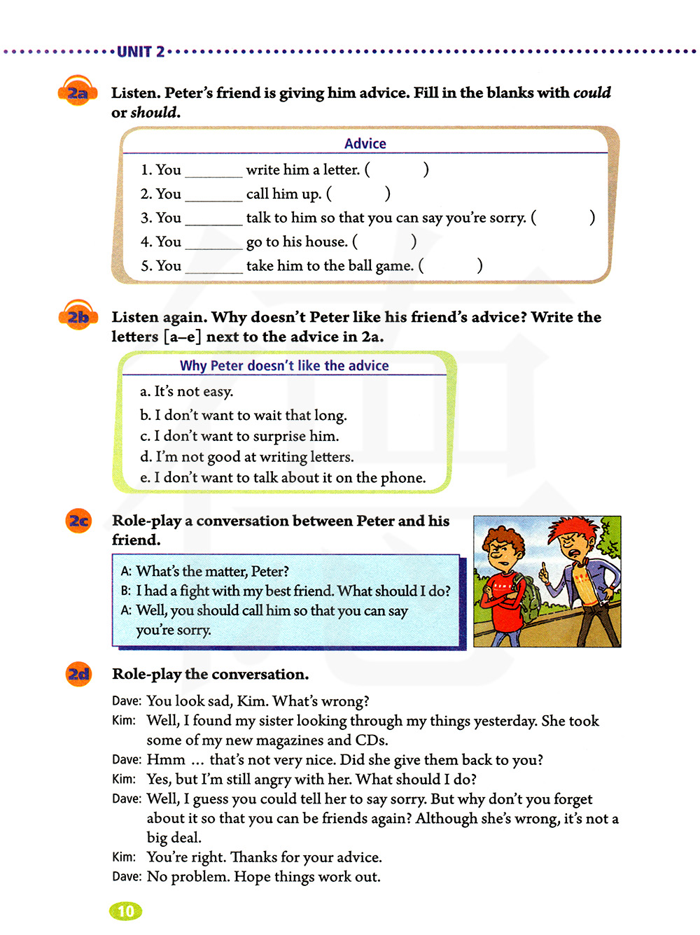 再听一遍。为什么彼特不赞成他朋友的建议?在2A中的建议旁边写上字母
