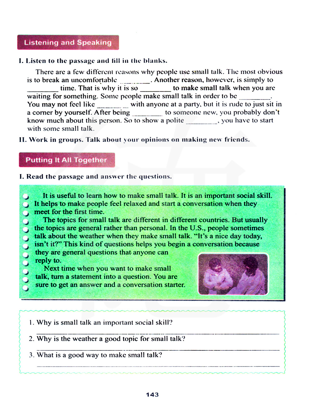 对如何闲聊是很有用的。这是一项重要的社会技能。当人们第一次见面时,它会让人感到放松,并开始交谈。