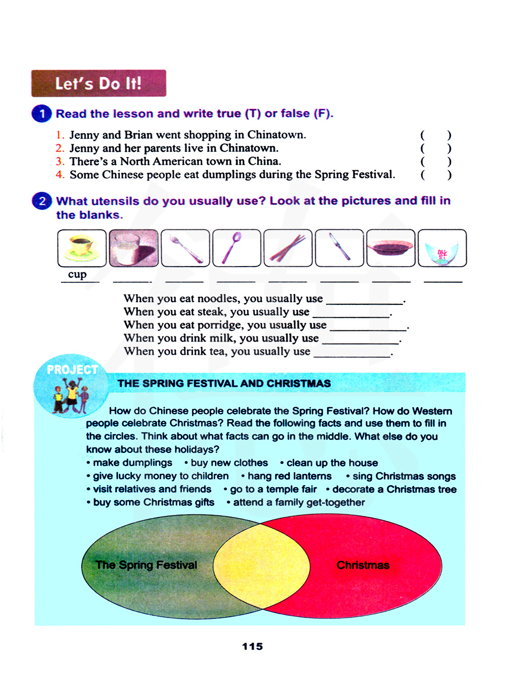 中国人事怎么样庆祝春节的?西方人是怎么样庆祝圣诞节的?阅读下面的客观事实,把他们填在圈里。想一下在中间部分可以写那些客观事实,关于这些节日你还知道什么